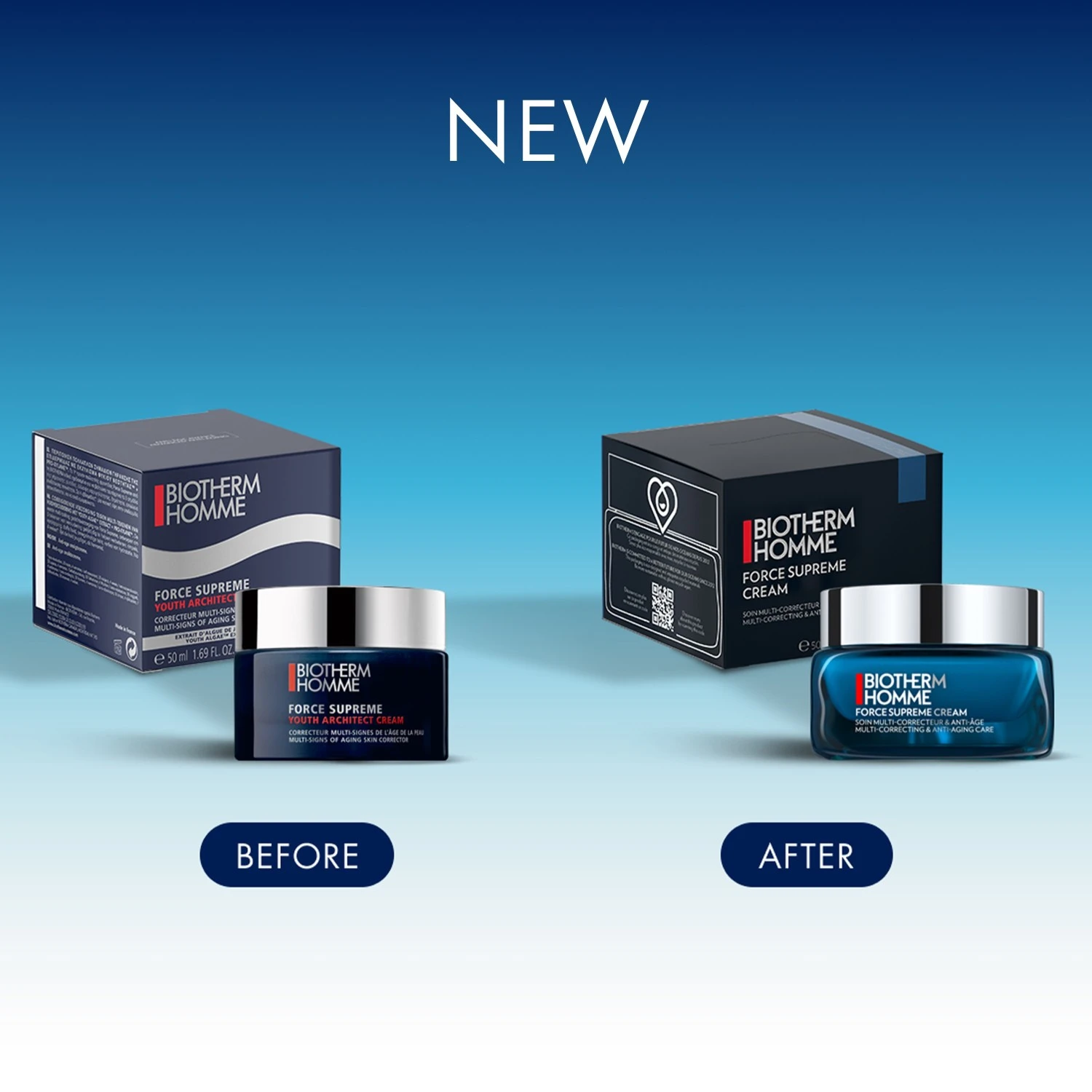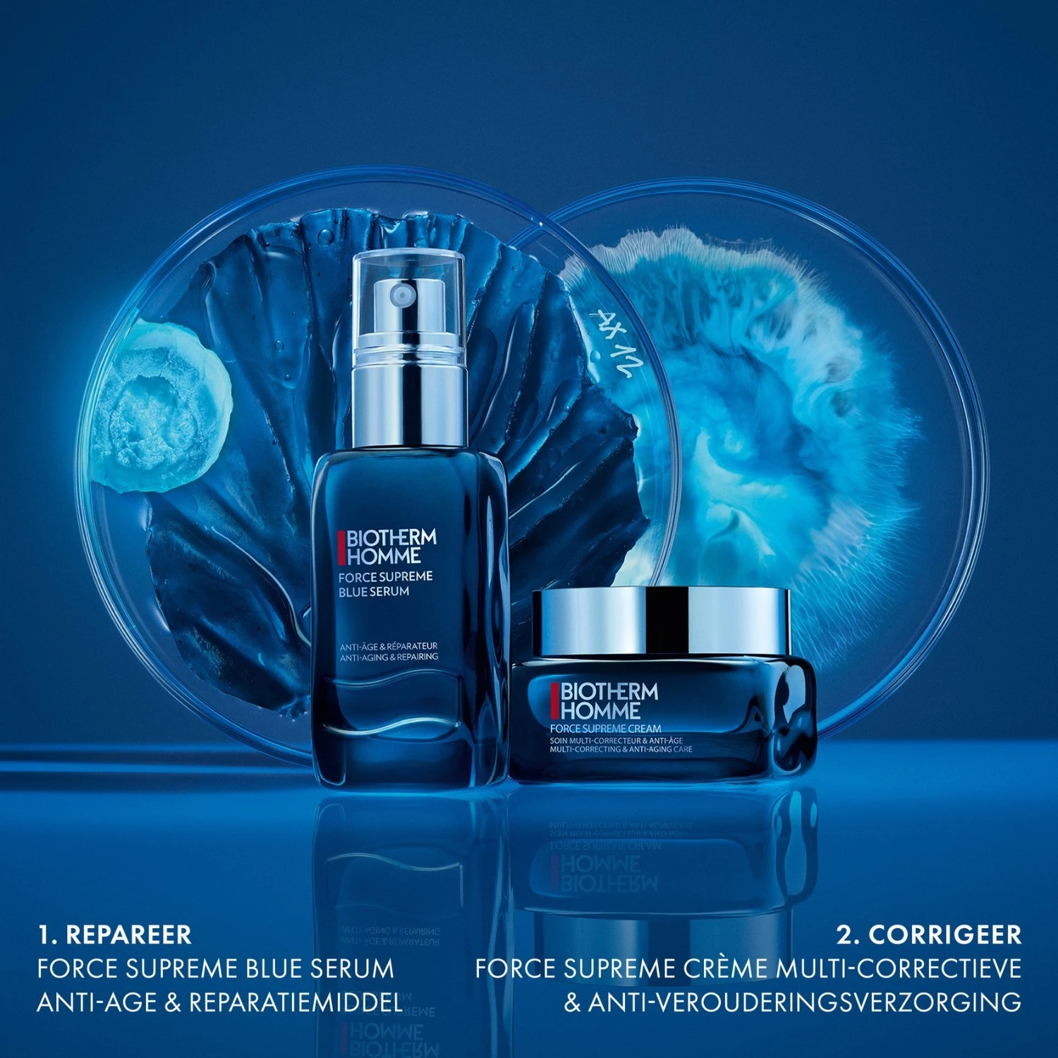 Biotherm Homme gebruikt een 3-in-1 technologie voor het Force Suprême anti-aging assortiment. Het Youth Algae extract™, het gepatenteerde regenererende Life Plankton™ en Prox-xylan versterken, verstevigen en verbeteren de huidtextuur.
